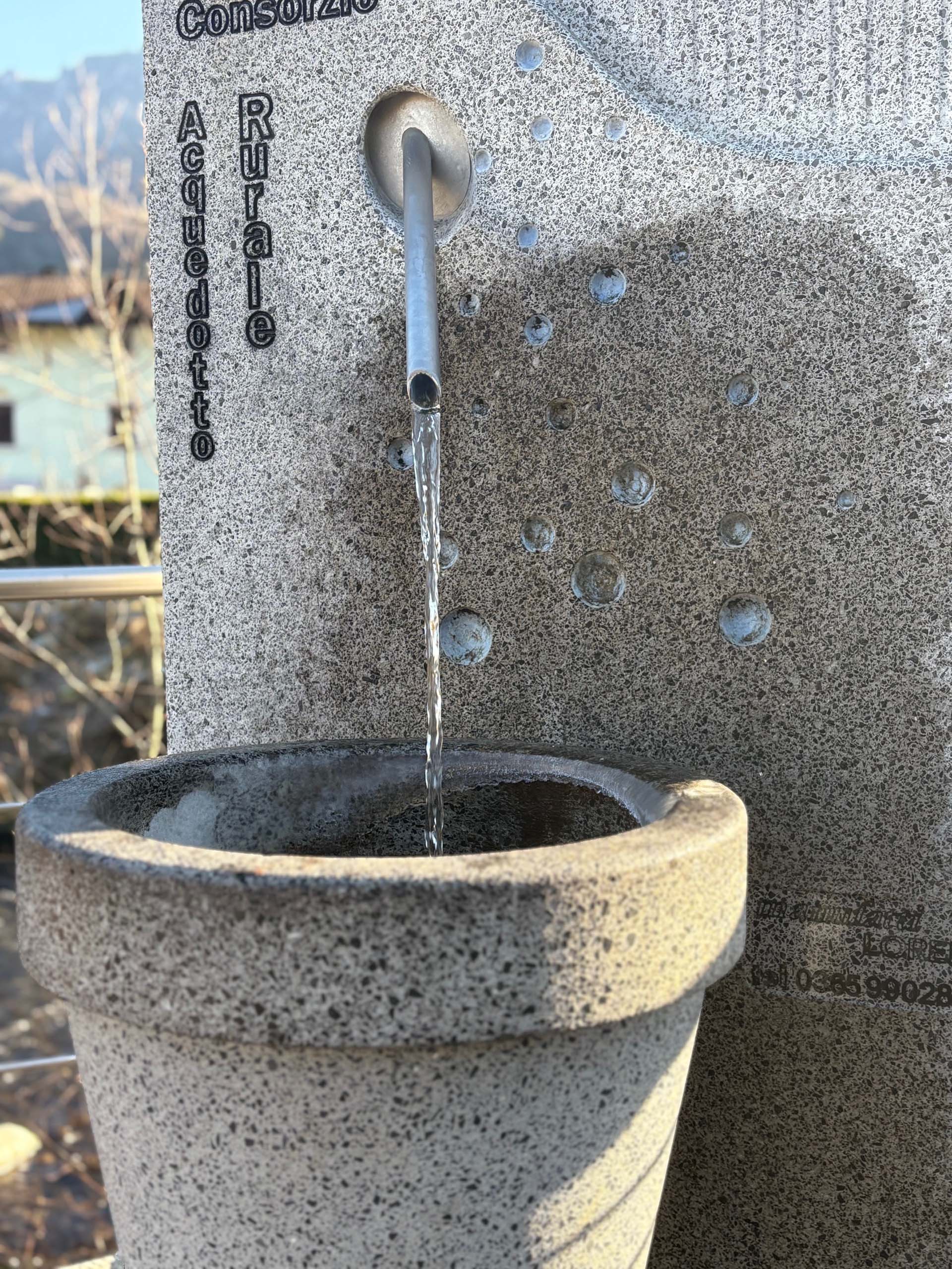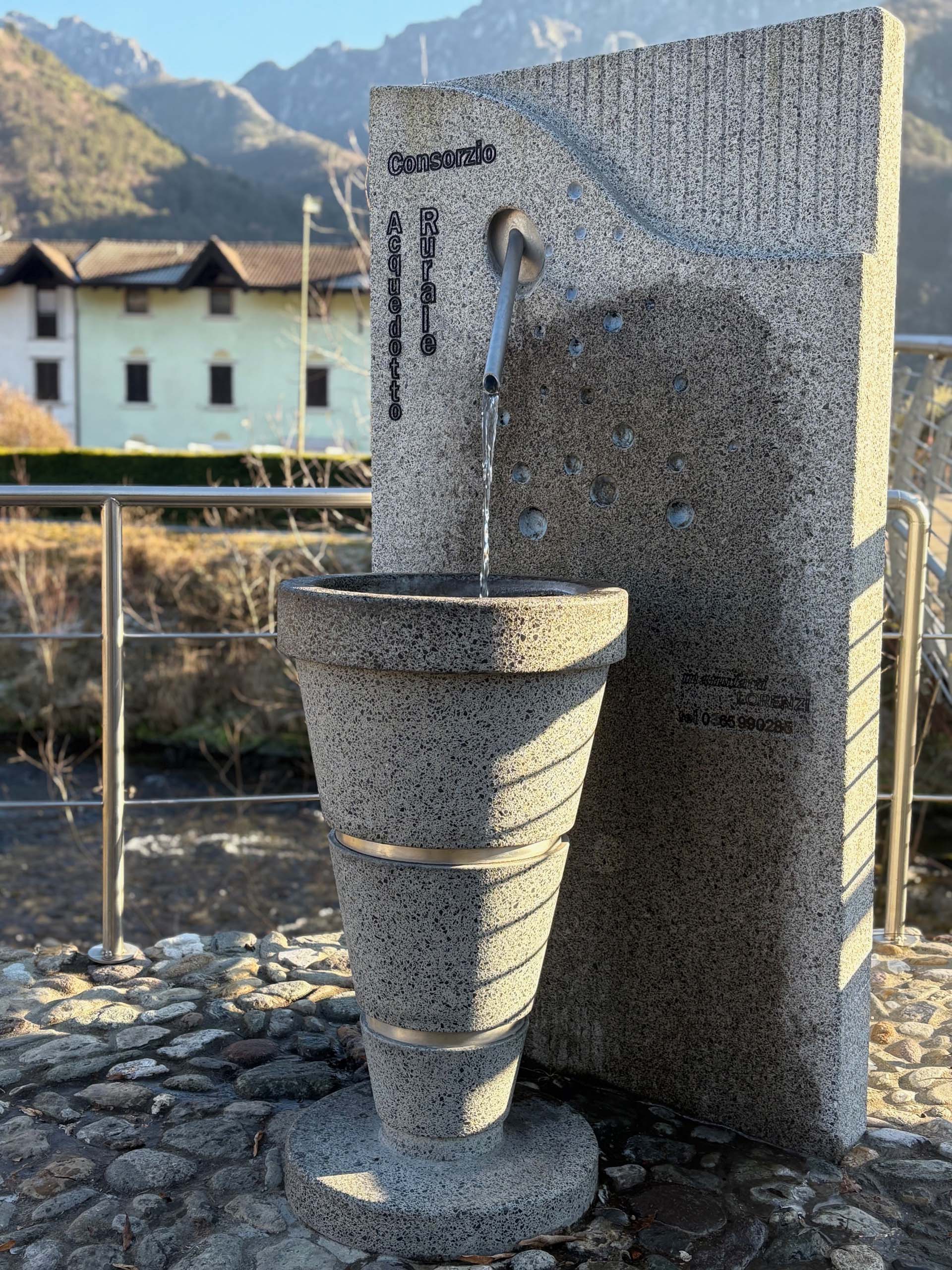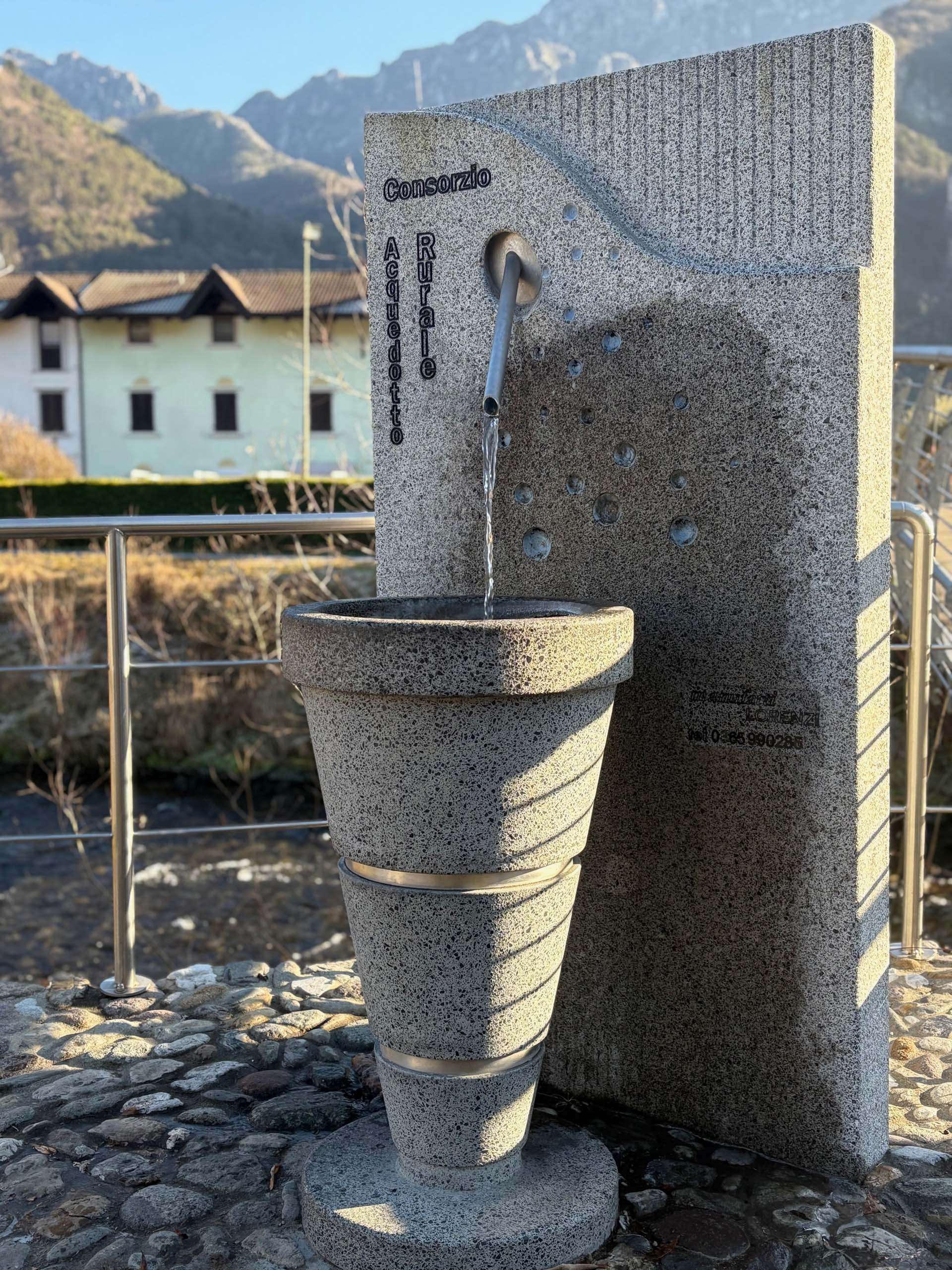 Un bicchiere pronto per essere sorseggiato, con una "cannuccia" d'acciaio da cui sgorga l'acqua pura. Un connubio perfetto tra la solidità materica della graniglia e la leggerezza di un'idea giocosa.